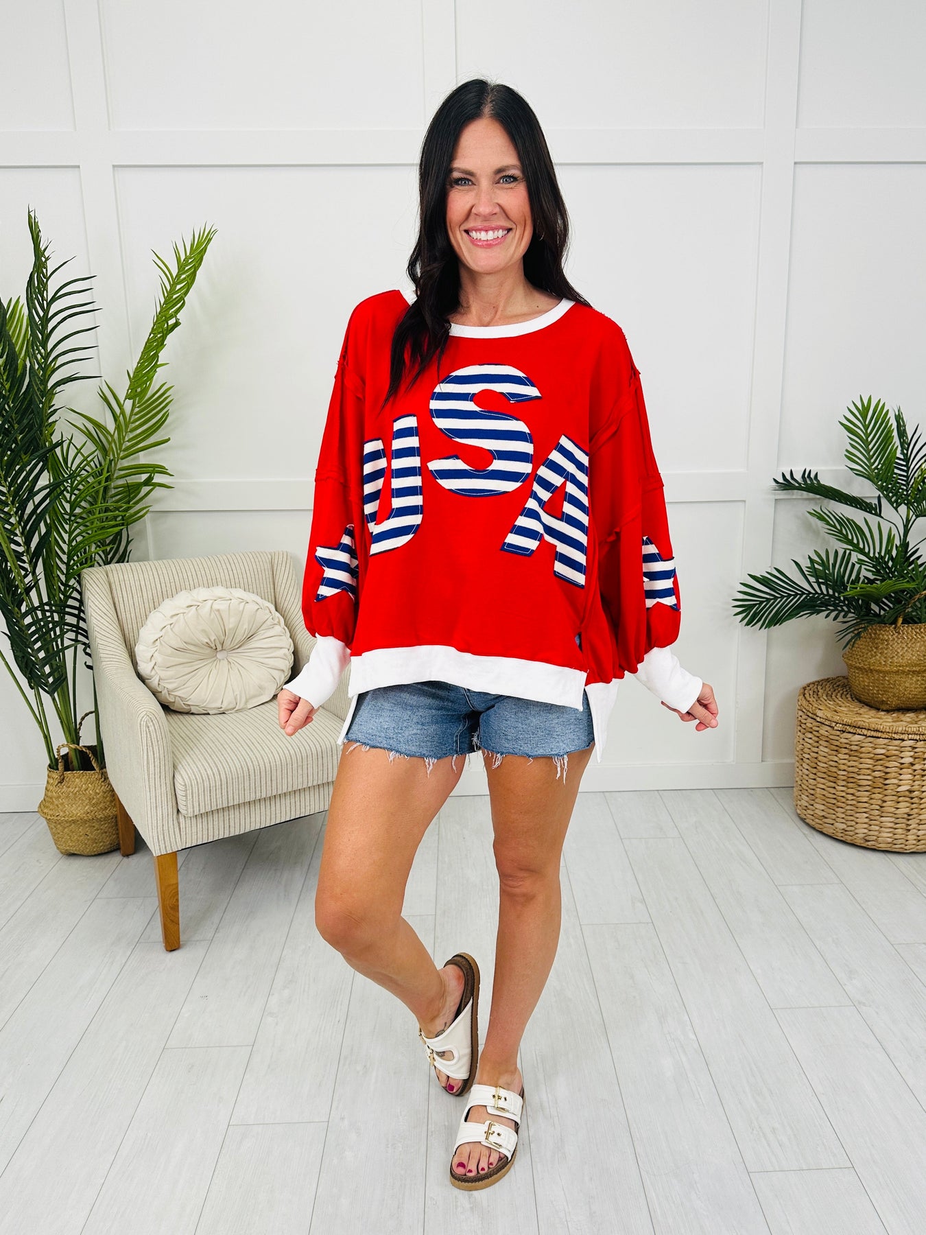 Celebrate in bold style with this vibrant top that’s made to stand out! Featuring eye-catching striped “USA” appliqués and playful star patch sleeves, it’s the perfect festive look for patriotic events. The contrast cuffs and hemline give it a sporty-chic finish, making this a comfy and fun option for any all American-themed occasions.