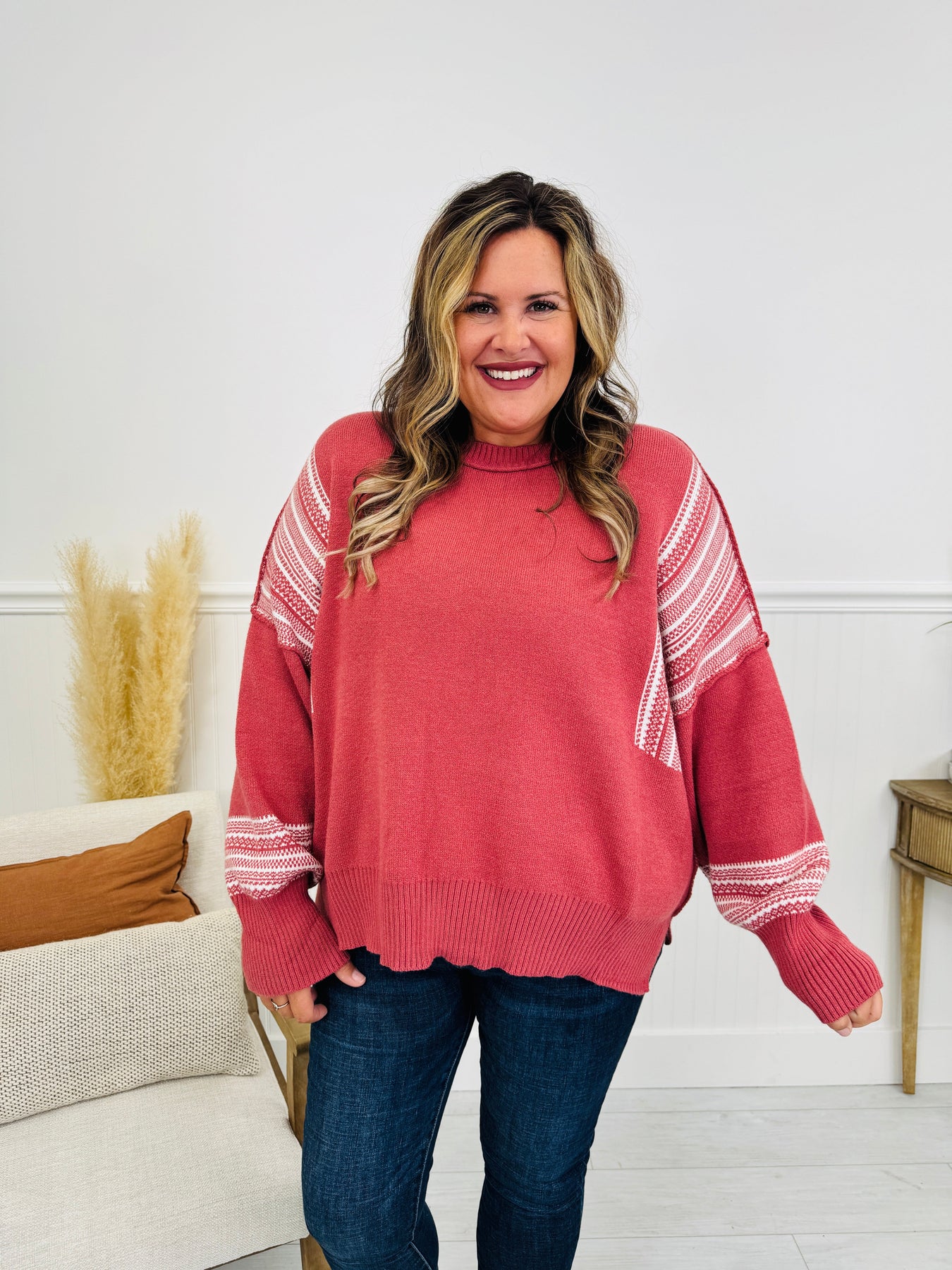 We love the reverse hem stitching that gives this sweater a high end look. Subtle striped details along the sleeves add a touch of texture and charm, while the relaxed hemline gives it that easy, lived-in feel you love.