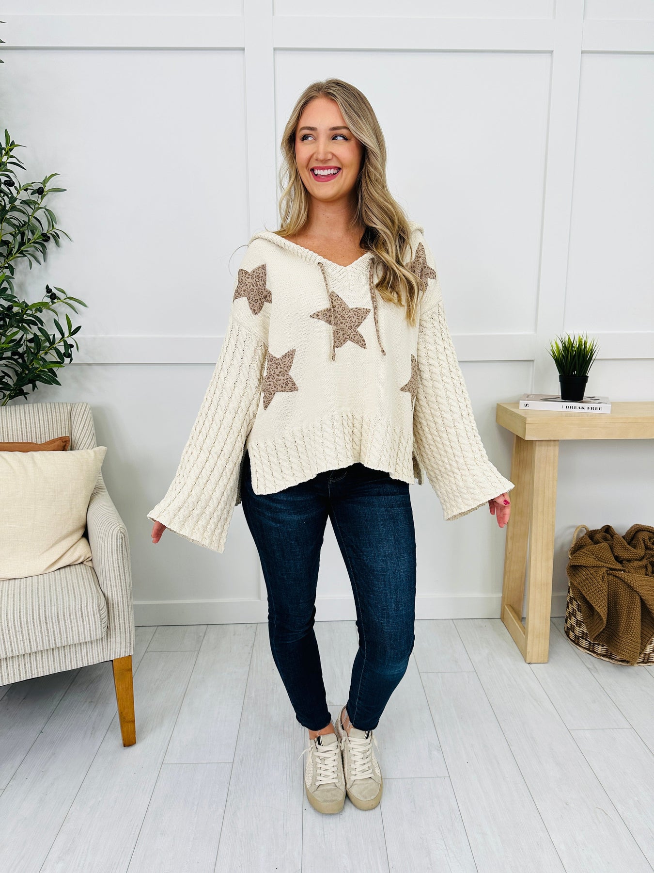 This cozy sweater combines a cable-knit texture with a cute pop of floral print star accents for a playful and chic look. The relaxed fit and drawstring hood add to its comfort and laid-back style, making it a perfect piece for any casual outing. With its neutral color and unique details, it's a great addition to your fall wardrobe.