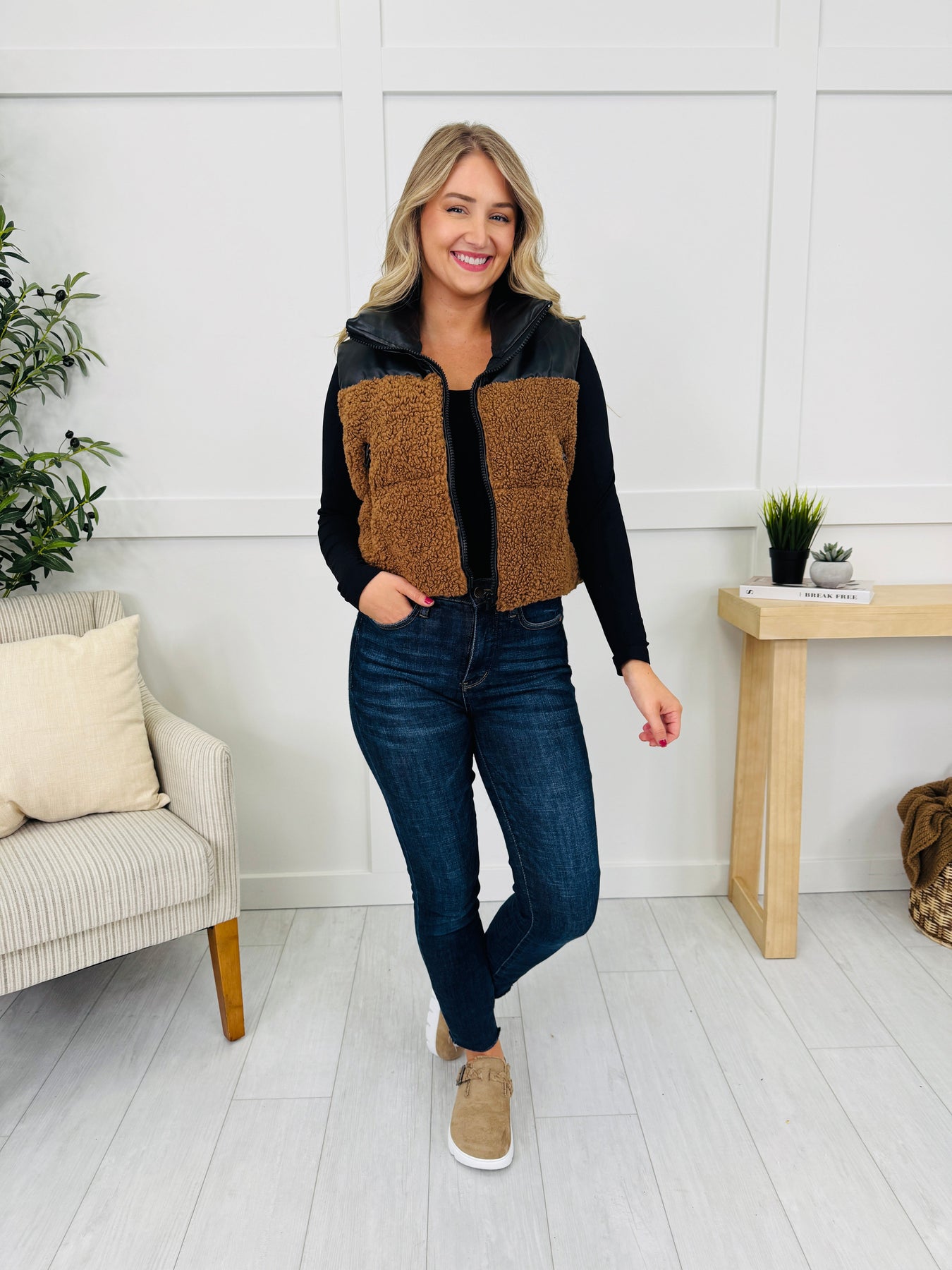 This vest is the perfect mix of cozy and edgy. The sherpa textured body gives it a warm, snuggly feel, while the faux leather contrast on top adds a sleek, modern touch. Finished with a zipper front closure and side zip pockets, it’s a versatile layering piece that will instantly elevate any casual outfit.