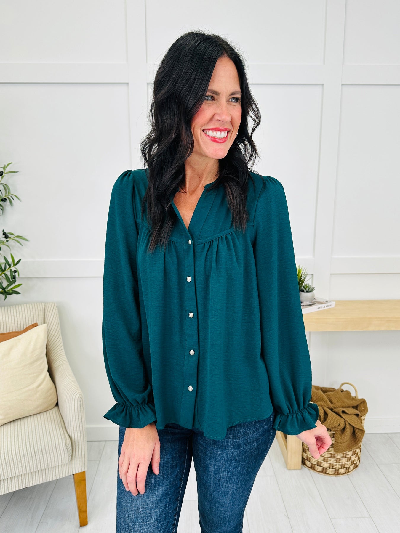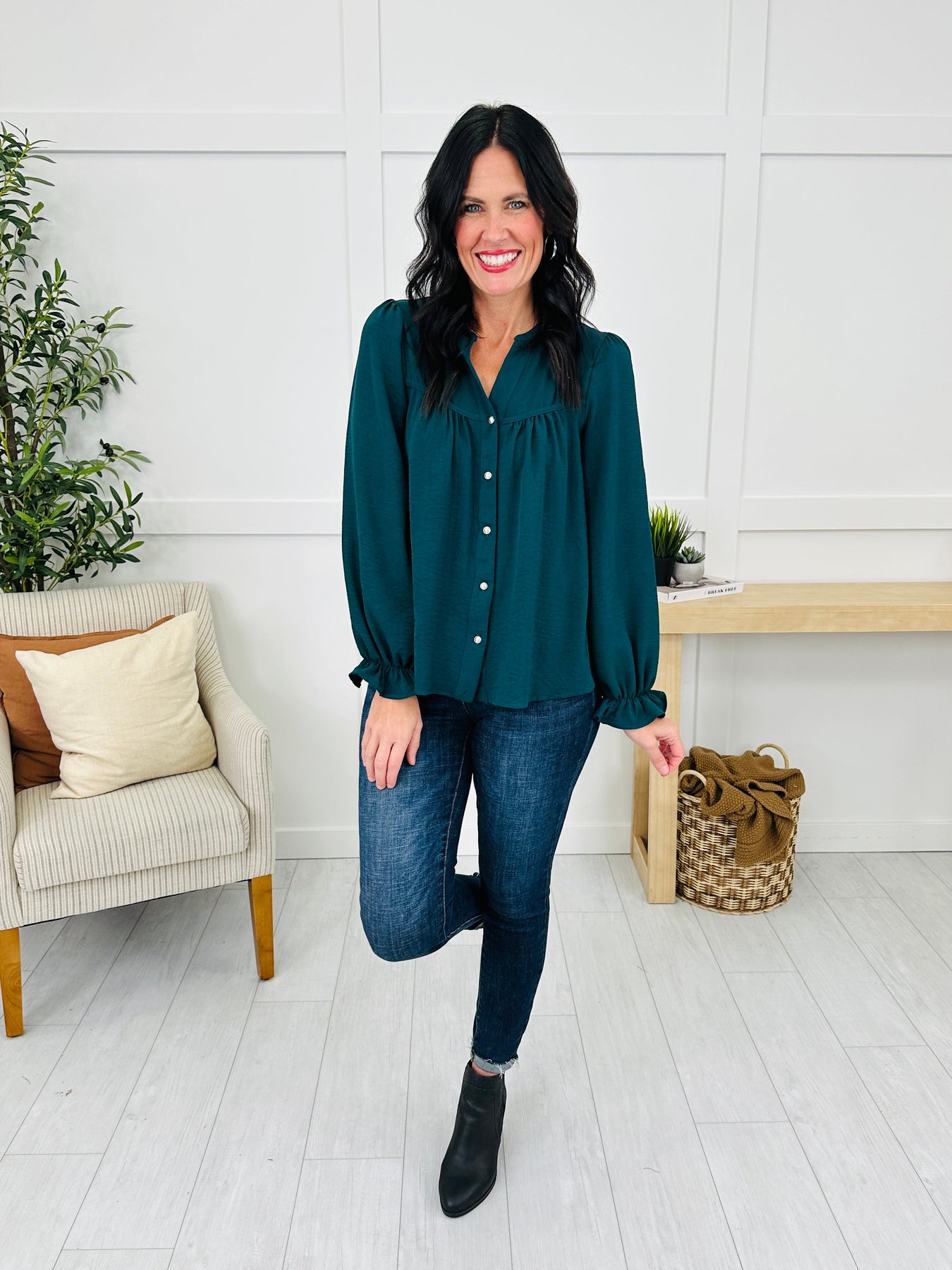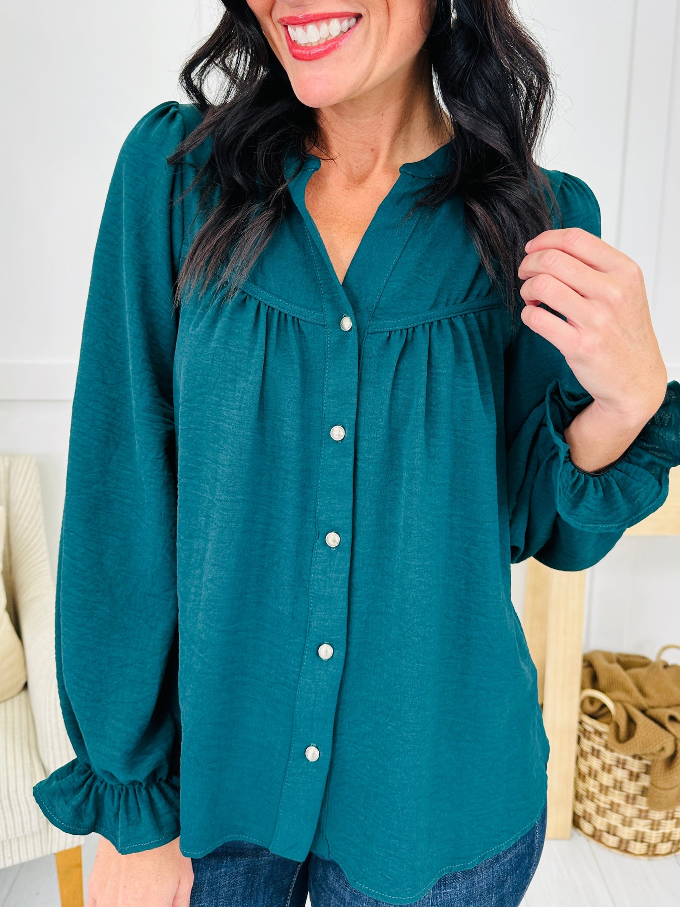 This chic blouse features a button-down front and delicate ruffled sleeve cuffs, adding a touch of femininity to its sleek design. The relaxed, flowy fit ensures comfort while maintaining a polished look, making it ideal for both work and weekend wear. With its rich teal color and subtle details, this top is a versatile addition to any wardrobe.